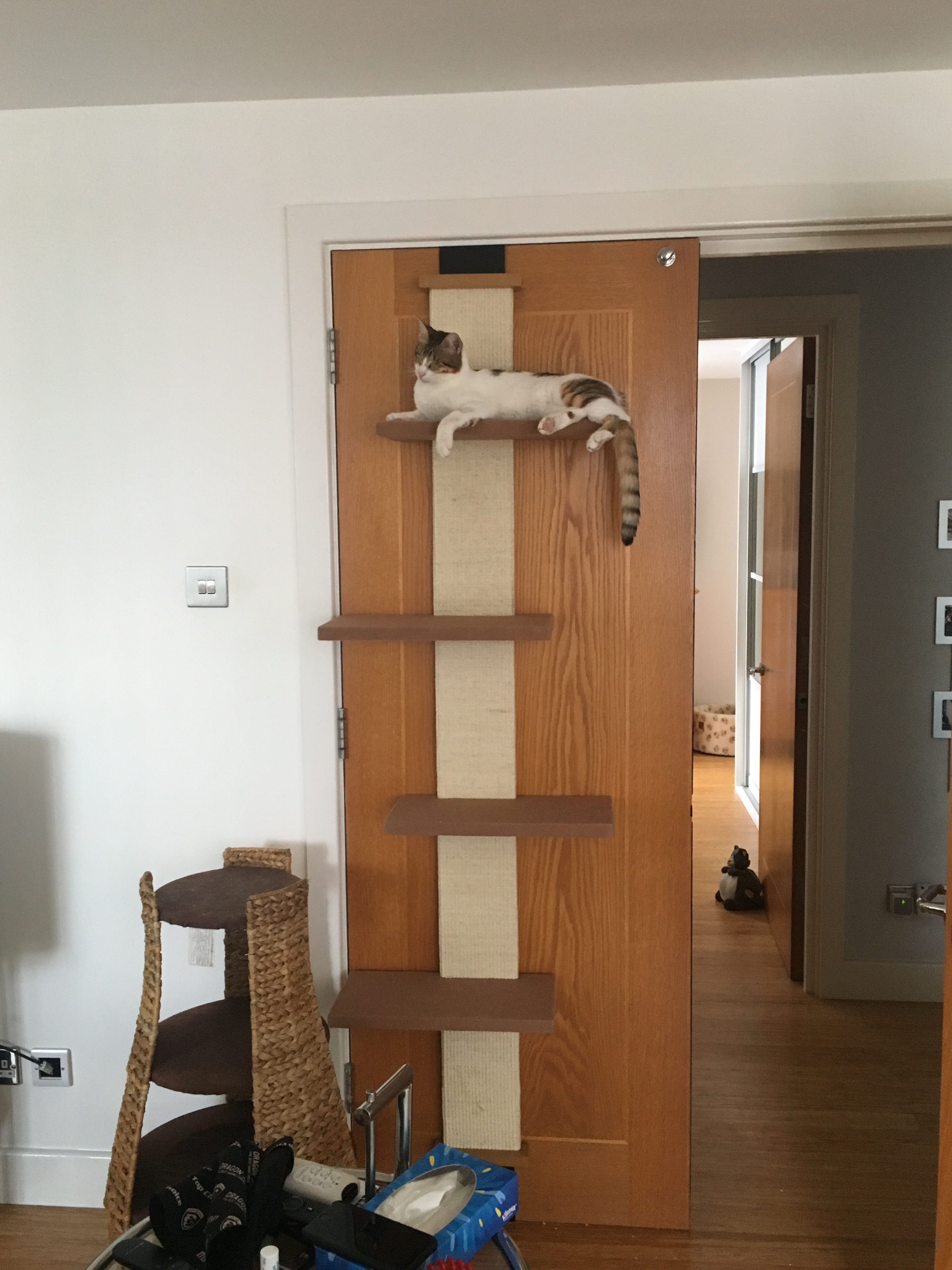 One of my favourite places to climb is the back of the door! This sounds odd to most people who say but cats can’t climb doors but I can, mummy and daddy bought a special climber that fits onto the back of the door, it has different ledges all the way up so I can climb right up to the ceiling.