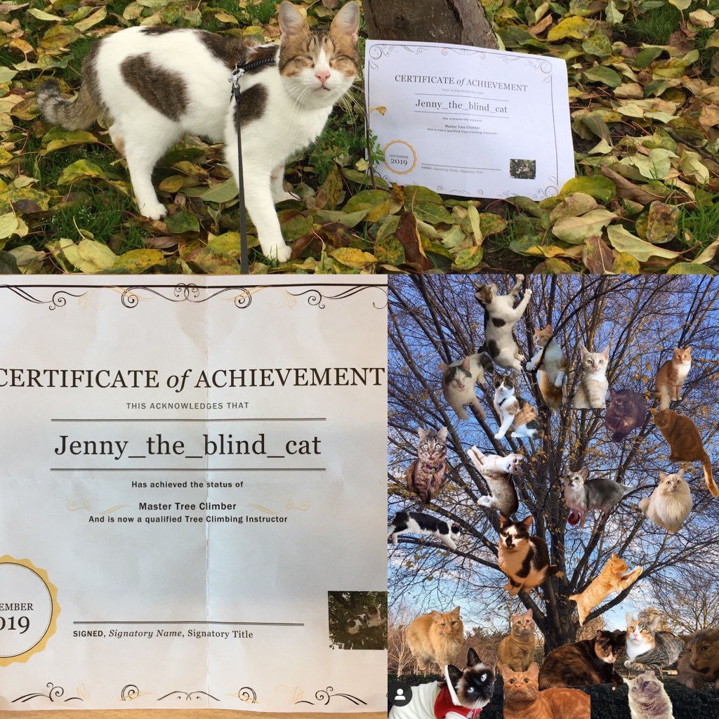 When I started my blog I decided that if I was going to be on the internet and become an internet sensation I would also start an Instagram accountant a Facebook page just so I could share my story and show the world what I do and who I am. Who would have thought that ‘@Jenny_the _blind_cat’ would get over 500 Instagram followers! I kind of accidentally also created a Facebook group “blind cats of the uk” which I administer and manage but now has over 100 members all sharing and promoting blind cats, rescue cats and those with special needs. I am now officially an internet sensation 😸.