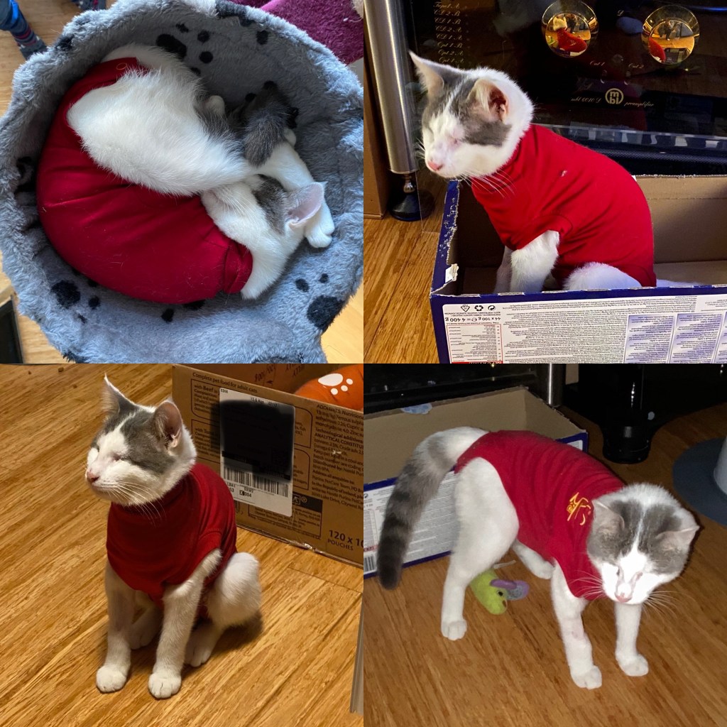 Mummy and daddy were not happy with us and told us off for being mean to Angelin. I felt a bit bad for her but she’s confused me as she just doesn’t smell as she should. I thought mummy and daddy might have tried to sneak another new cat in which I was not happy about. Mummy told me that it was Angelin but they had put her in some kind of clothing to stop her scratching or washing her operation scar whilst it healed.