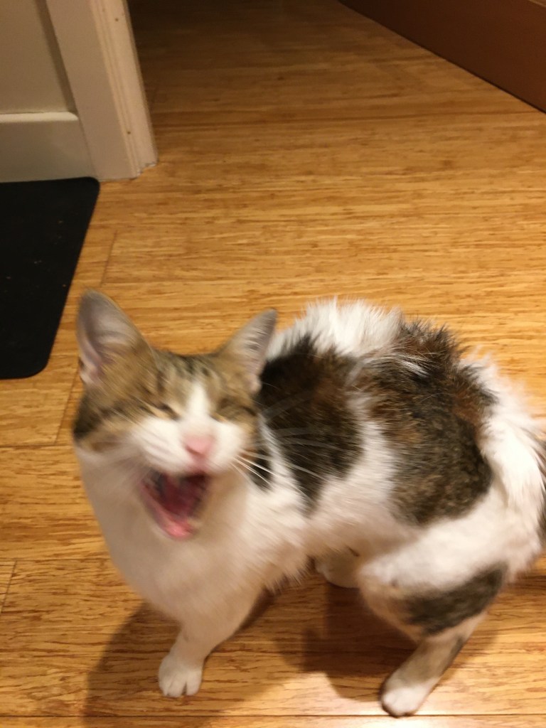 The damp hands game works like this, mummy does the washing up and gets her hands all wet and foamy, she bends down real close to me, right down on my level and then rubs her damp hand all over me, she runs her fingers up and down, backwards and forwards over my back and sides, ooh it feels so good! She makes my fur go all spikey but I love this, I shout and meow at the top of my voice with joy. Again mummy, again, again! When her hands are dry she washes off all my fur and off we go again. We’ll carry on doing this until my fur is soaking wet and there’s no more bubbles left. After we’ve been playing mummy says I look like a punk cat coz of my spikey fur.