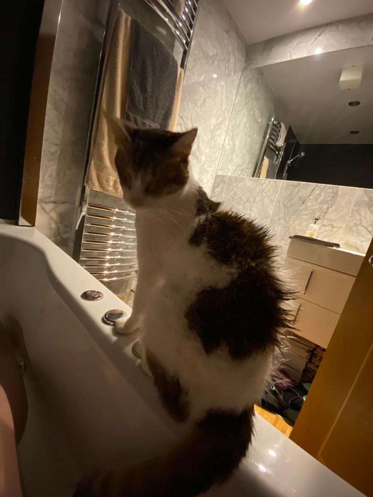 Most mornings I get up on the perch on the back of the door to say goodbye to mummy and give her kisses so I sneaked in a couple of little licks as well just to make sure she’s properly clean before going off to work. Daddy gets the same goodbye every morning and we all see him out of the front door so one of us can give him a quick wash on the way out too. Our little sandpaper tongues can get into all the hard to wash places that you humans might miss.