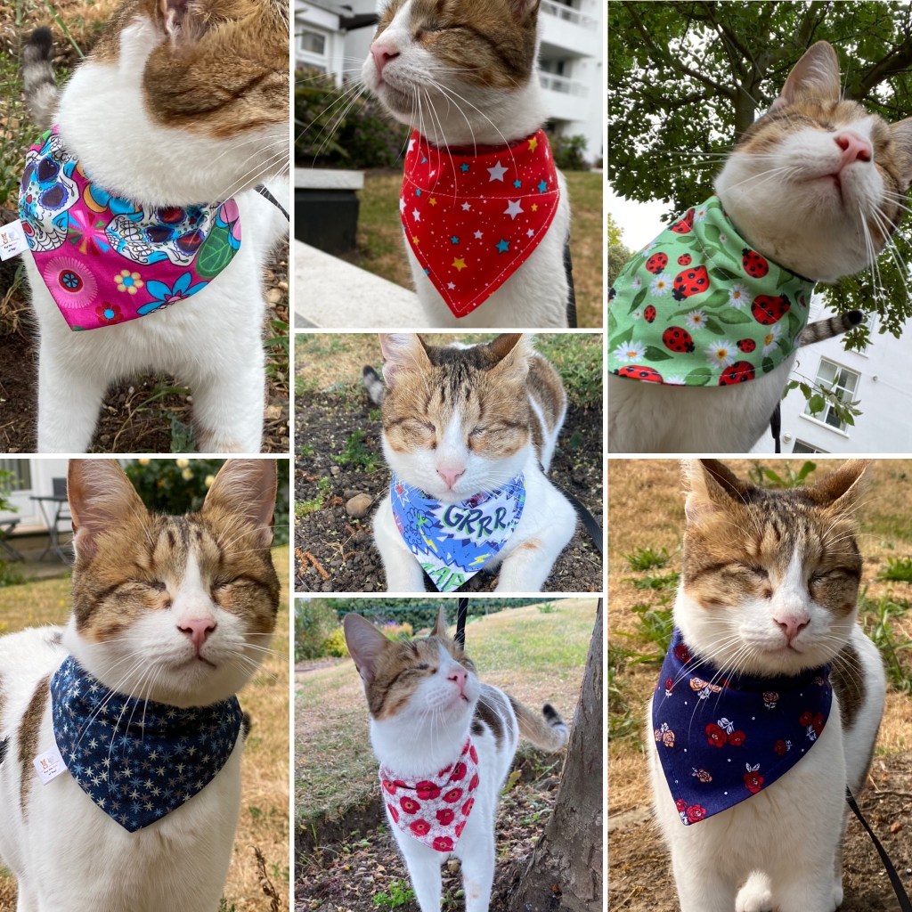One thing was different though as when we got indoors mummy said that there was something for me that had arrived. Well, I don’t think anyone has ever sent me anything before so I got very excited, what could it be I wondered? I was so excited I started doing circles round and round at mummy’s feet. “Open it, open it” I said to mummy, she was crinkling the packet and I could hardly contain myself, “what is it, what is it mummy” I meowed. It seemed like it took her ages to open it, I just couldn’t help myself and let out a huge loud meow – “hurry up mummy” I shouted. “Calm down Jenny!” she said, “I’m going as fast as I can.” Then she said “Oh Jenny you’re such a lucky girl, look what you’ve got, some beautiful new bandanas. You’re going to look so pretty when we go for walkies.” Oh Wow I got a present 🎁 “Mummy tell me what they look like.” As she took each one out she described it to me and I could picture how each one looked in my mind, they all sounded so lovely. Everyday when we go for walkies we ask daddy to choose which one I should wear and today was no different other than daddy had some new choices to make. Over the next few days I got to wear each of my new bandanas and I love them all. I’ll let you all decide which is your favourite. I feel like such a lucky kitty for getting such beautiful things.