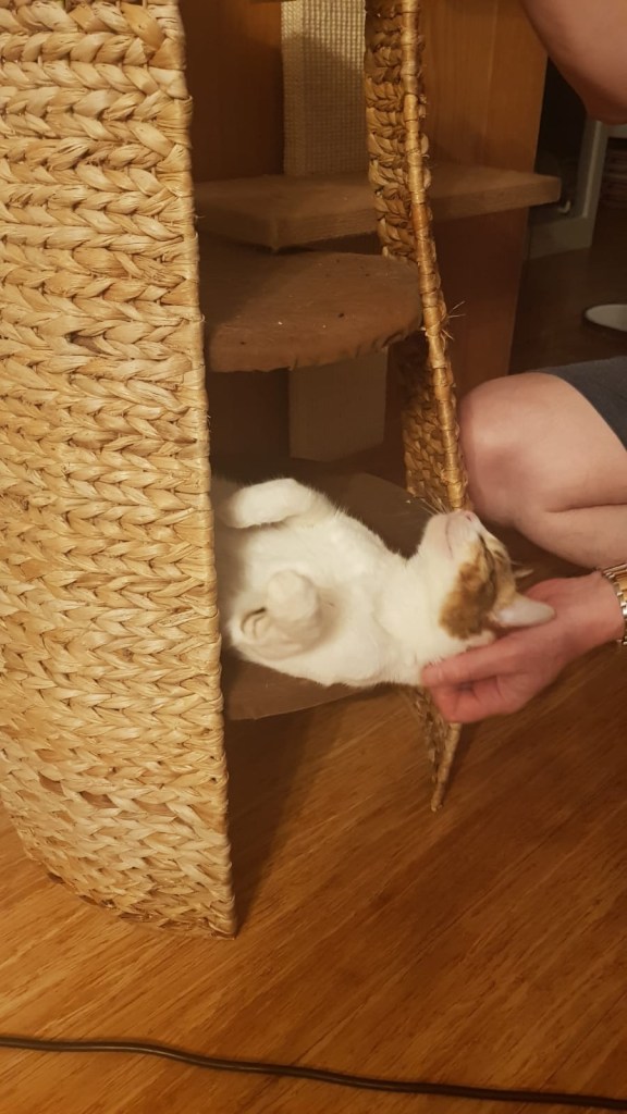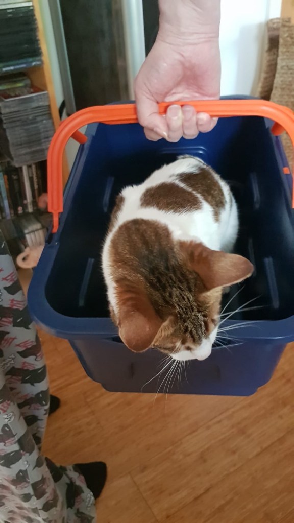 Daddy thought me how to play the ‘ready, ready game.’ Just in case you don’t know what this is, daddy gets a toy or rolled up ball of paper or foil and stands in the kitchen doorway. I go to the other end of the kitchen, he gently rubs his foot on the floor so I know where to run towards then, when he says “ready, ready Jenny” that’s my cue to run forwards to catch the toys (or daddy’s feet), as I’m running forwards he kicks the toy and I then either have to catch it as I’m running or if he kicks it past me then I have to do a quick turn around with my lightning reflexes and run back to catch it. If he’s too slow then watch out feet here I come! Once I’ve caught it we go again and again, over and over until I’ve worn daddy out! Sometimes I’ll pick it up and take it back to him and sometimes he has to come and get it. It’s funny though as I play this game with both mummy and daddy and they both play slightly differently but I like playing it with daddy best as he invented the game with me. Sometimes we also play kitten in a basket, this was a game daddy invented with my big sister Mia before I was even born and occasionally we play it too, the idea is I jump in the box and daddy gives me a tour of the flat, we say hello to mummy on the way round as well as Peppar, Millie and Angelin. The tour ends back wherever we started and then I in can jump out and pay daddy his tour guide fee of a hand rub, kisses and quick wash