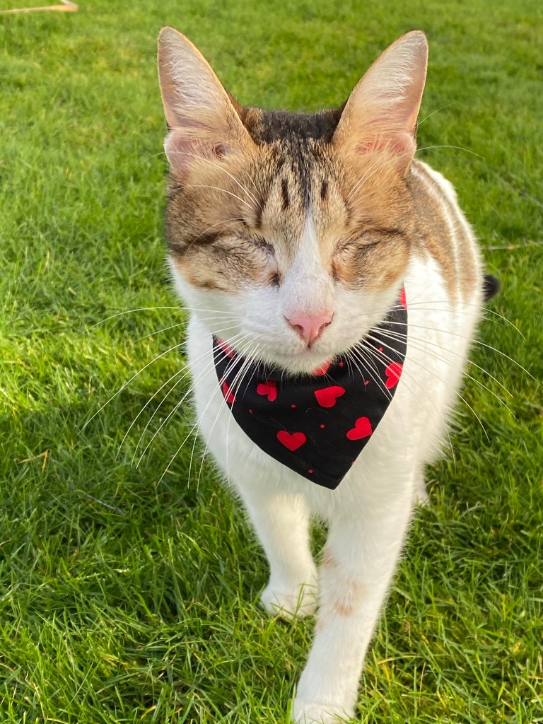 Whenever mummy and I go out for walkies, daddy is the one who chooses which bandana I’m going to wear which strange as mummy says he has no fashion sense at all as all he wears is black! I love daddy choosing what I wear as it means that he’s part of my whole walkies experience, he always tells me how pretty I look in them before I go out. When we come in, he’s always so pleased to see me “did you have a good walkies Jenny, where did you go, what did you see? Did you chase anything or climb any trees? Have you been rolling again?” I rush up to him and and meow to him about everything we did whilst on walkies. He always makes sure that dinner is ready for me when I get in as I’m usually hungry after my adventures. Sometimes he even brings me dinner up onto the ledge of the scratching post so the others can’t interrupt me and try to steal my food we call it ‘dinner in bed’. I feel so spoilt and so lucky when I get this special treatment, it’s something that only daddy and I do.