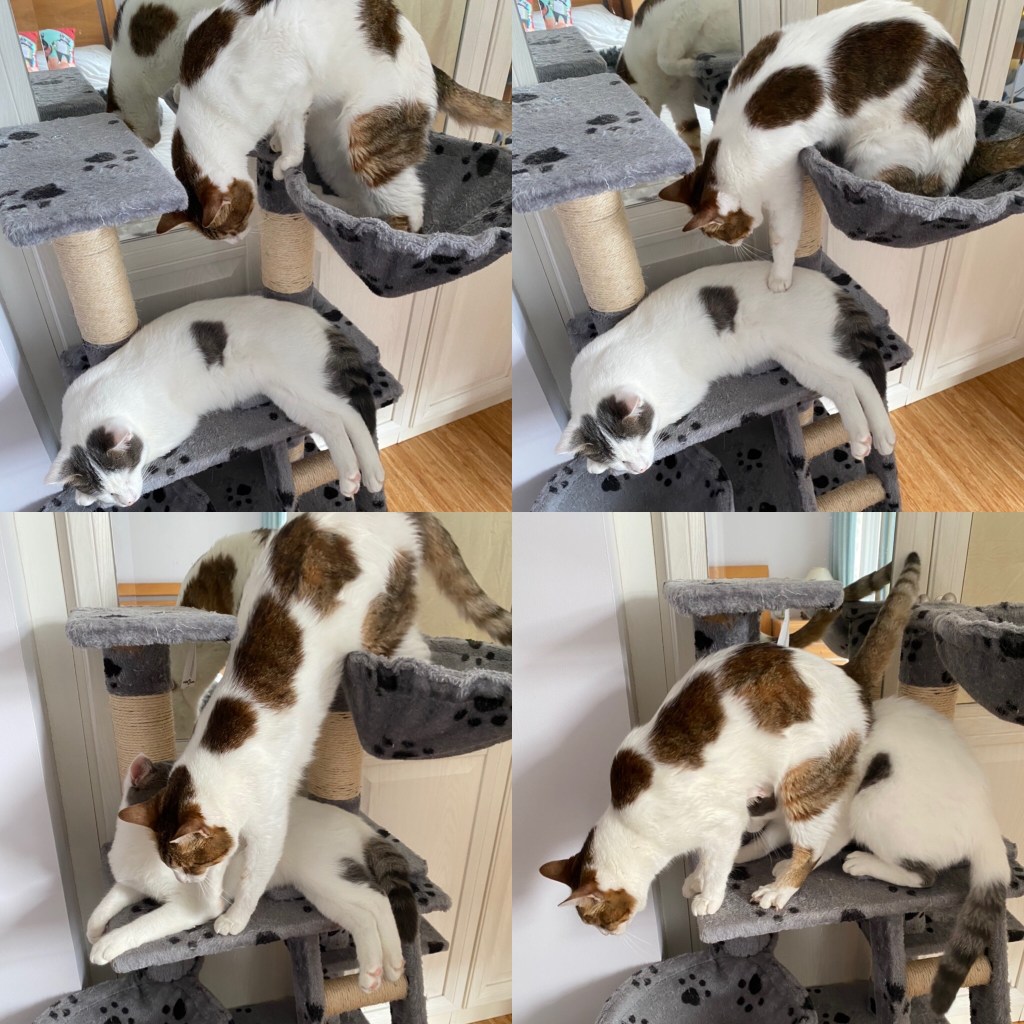 Sometimes, I get my own back on Angelin’s dirty street fighting by ‘accidentally’ sitting on her head when I’m getting down off somewhere like the cat perch and Angelin is below me. Mummy says there’s a human saying ‘what comes around goes around’ and this seems very appropriate for Angelin’s naughty fighting technique. I remain top cat, Angelin gets put back in her place and I get the last meow 😸.