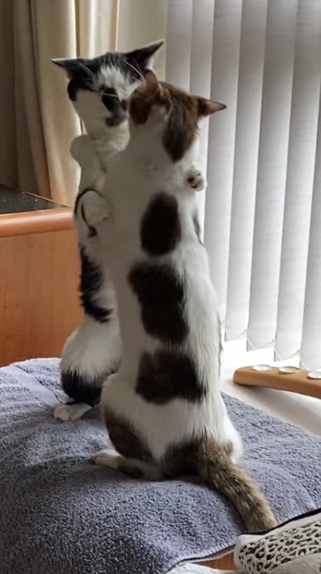 Angelin and I are both ex street cats and so we are quite rough players, I started off being gentle with her and taking it a bit easy on her as she was very little but over time she’s become a strong, determined little fighter and she’s getting more accurate with her pounces and punches. She’s also a dirty fighter and you often end up with a bum in your face or having your head sat on. She gets so excited she gets a big fuzzy tail and all the hairs on her back stand up, we call this her fighting ridge. When her fighting ridge is up she’s turned into a big fearsome fighting cat rather than a slightly out of control punk kitten according to mummy and daddy.