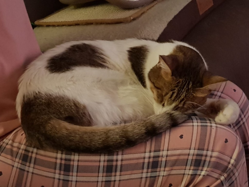 Once mummy and daddy settle down for the evening then I have a little play of football with them and then go for a snooze, normally in one of the beds up behind the sofa where I can keep an ear out for anything going on. Then when it’s later into the evening I quietly come down the back of the sofa and very carefully creep onto mummy’s lap, make myself comfy and curl up. Her lap is nice and warm and I also get a gentle stroke from time to time as well. I’m not much of a lap cat but just between you and me recently I’ve found that I quite like it, specially when it’s a bit cooler in the evenings so maybe I’m changing my habits.