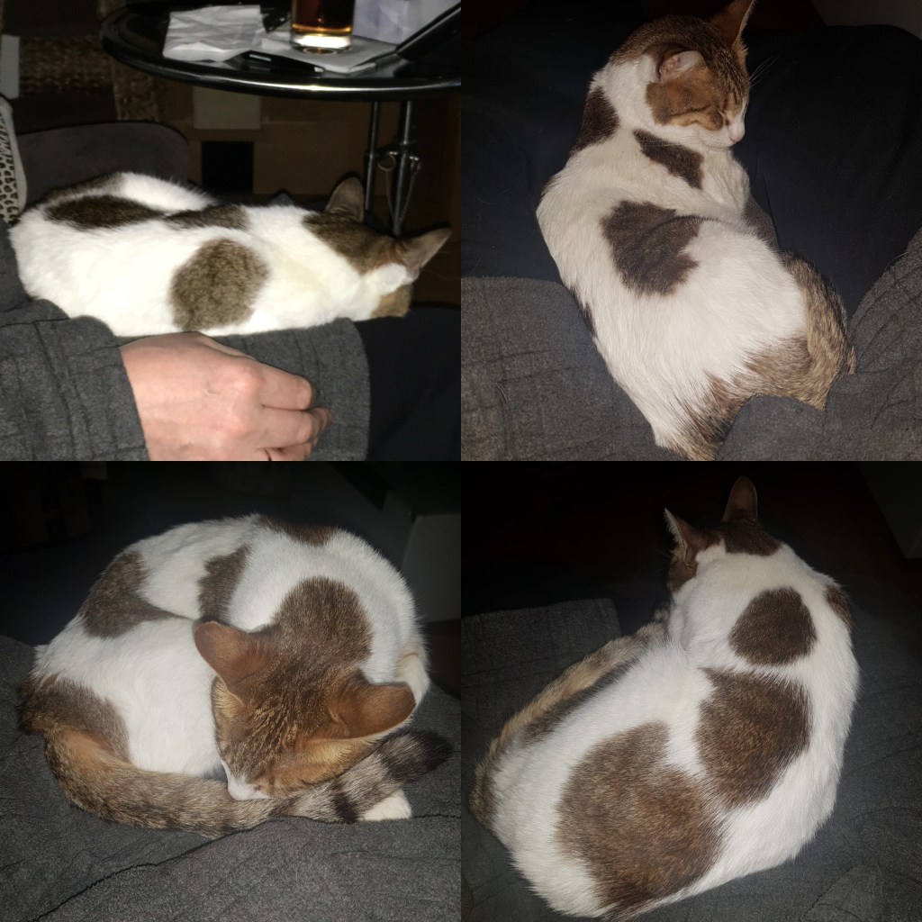 One evening I was sleeping on one of my usual spots in the bed behind daddy’s sitting on the sofa, after a while I crept down the back of the sofa to find a warmer spot as I usually do but instead of heading across to mummy’s lap I just plopped down onto daddy’s lap and curled up there instead. As I settled down and got comfortable I could hear daddy whispering to mummy “look, she’s never got on my lap before!” mummy was saying that all I need is a little stroke from time to time and I’d be fine. It was nice to feel daddy stroking me gently as I drifted off to sleep on him. His lap was warm and cosy and it’s a bit more padded than mummy’s and with a bit more space to curl up on. I was so cosy on there that I even let daddy pick me up, put me on the sofa when he really needed to get up and then I let him put me back on his lap when he came back. Snuggling on daddy’s lap made him very happy and so that made me happy too, I’m not sure why I haven’t done it sooner but I might just do it a bit more often now.