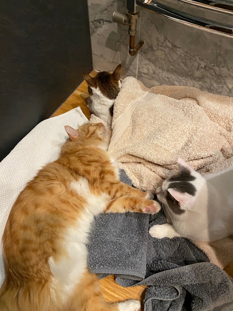 Every time I go out in the cold, daddy is waiting when I get back in to take off my harness and give me a rub down with the towel to dry off and warm up, he even dries off my cold, cold paws. Sometimes I pull the warm towels off the hot towel holder and snuggle up on them with my sisfurs all cosy and warm.