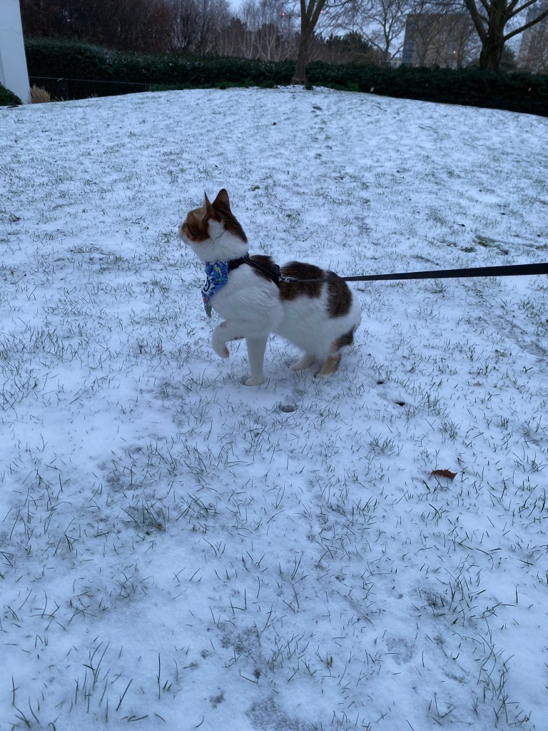As I start to explore the snow is cold on my feet so I stop for a very short while and lift one paw up to keep it from getting colder. Then my nerves start to calm down and my inner adventure cat starts to take over and off I go running around, a quick sprint across the garden and hey this isn’t so bad.