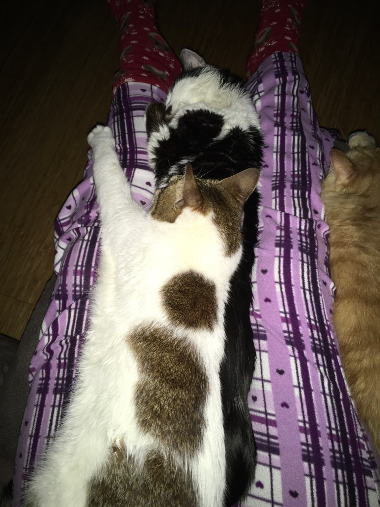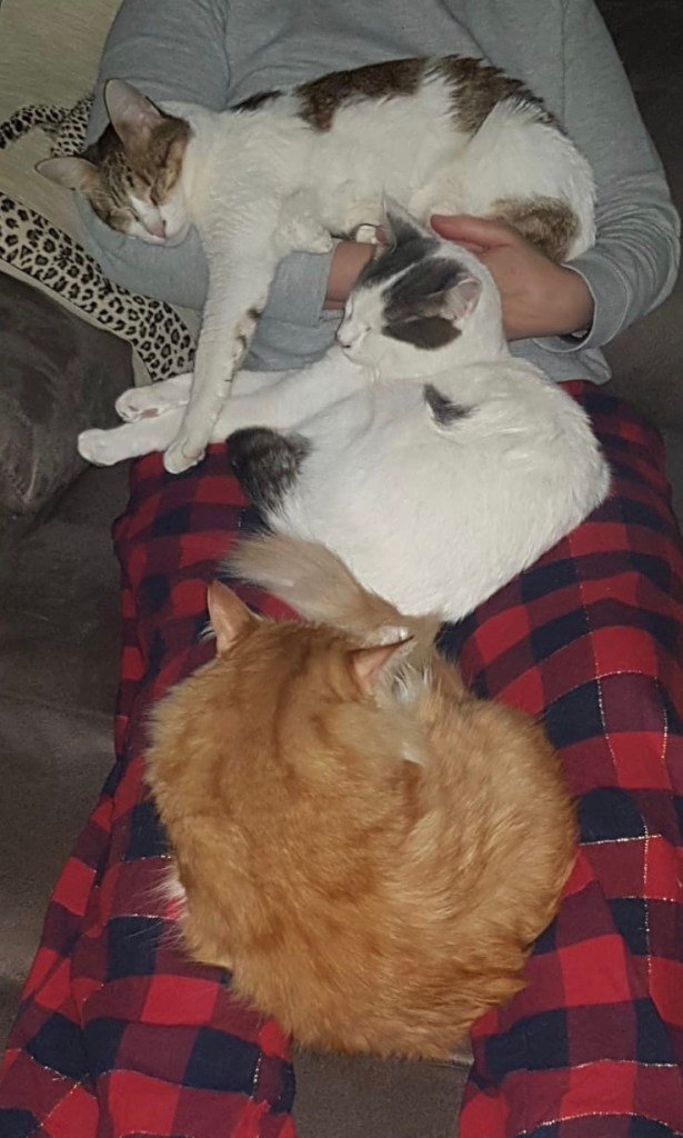 We had some sad times along the way with the loss of my big sister Mia but that gave way to happiness (eventually after a very rocky start) with the addition to our family of my little sisfurs Millie and Angelin. Mummy and daddy say that us girls are “as thick as thieves” whatever that means but we get on so well and we all love playing together, fighting and occasionally snuggling together too. Peppar is my best buddy though, he gives me so much support and I’m the only one allowed to snuggle with him in his snuggle bed or on mummy’s lap and he doesn’t even mind when I snuggle right on top of him.