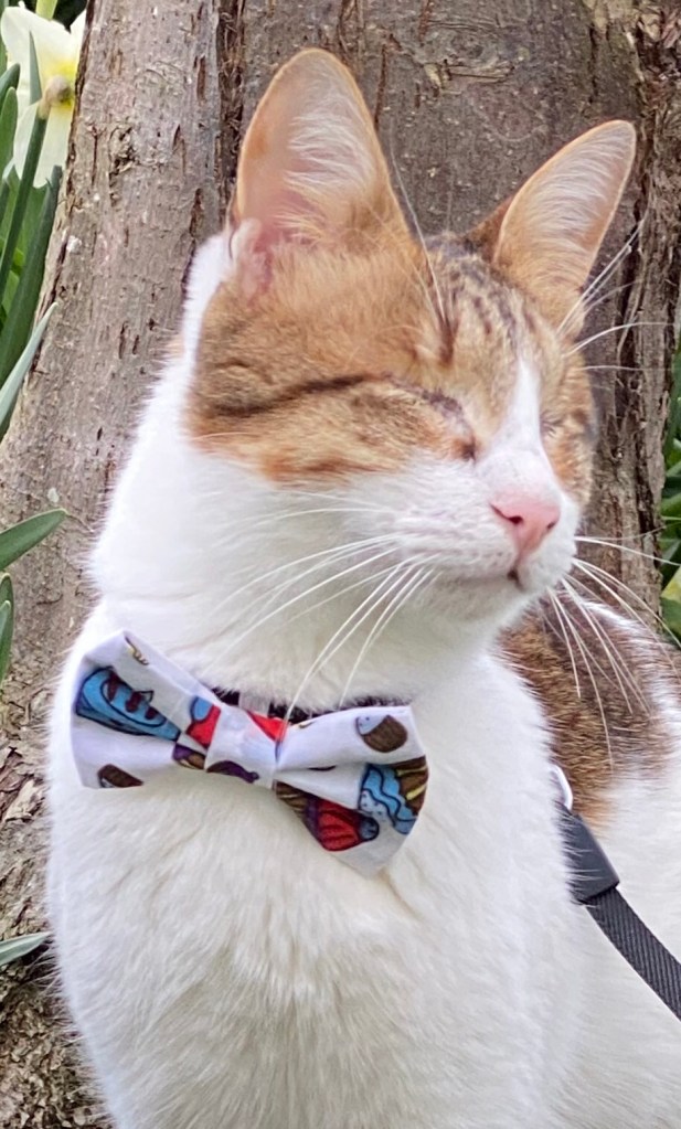 All week I’ve been celebrating my adoptaversary, mummy and daddy said I could do all of my favourite things, so we had pizza 🍕 with my favourite olive topping, I was allowed an extra helping because it’s such a special occasion. I also got a present 🎁, I love presents and when mummy and daddy helped me open it inside was a beautiful new giant pawty bow tie to add to my stylish collection. What a lucky kitty I am to be given such nice things to wear when I go out on walkies. A girls gotta look her best after all.