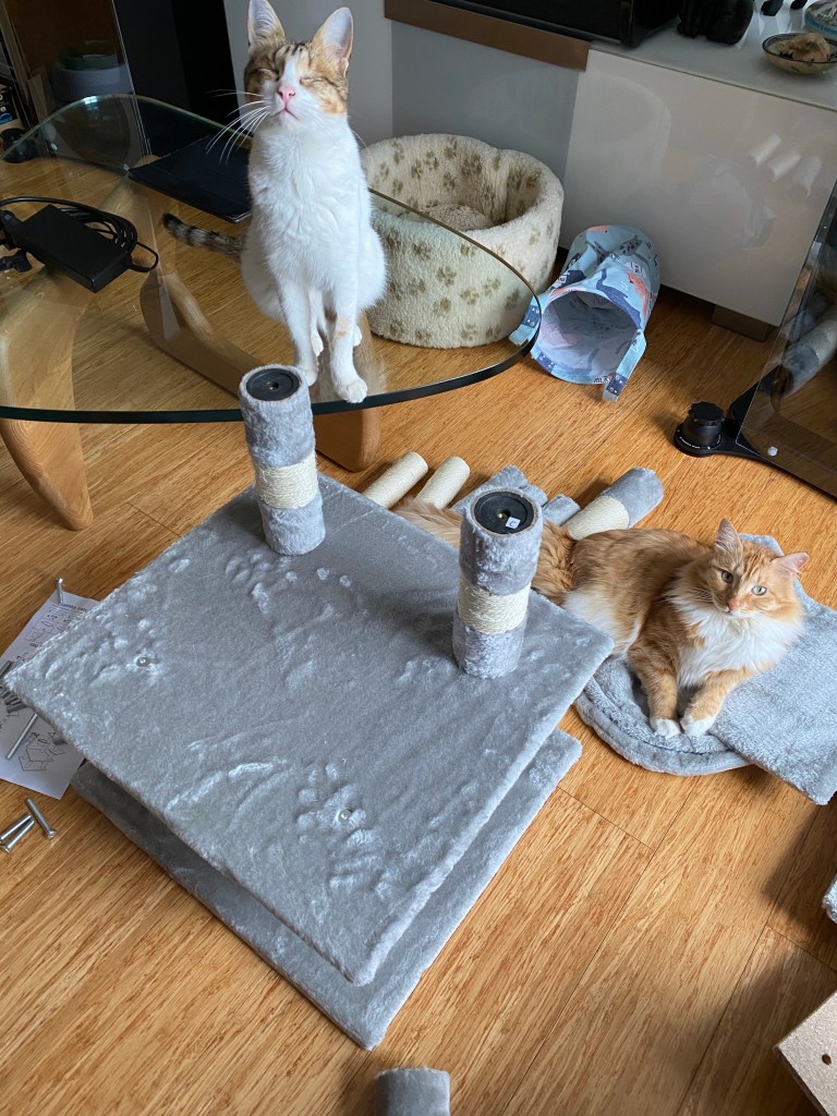 One day a big box arrived, mummy and daddy told us that it’s a present for us, a present how exciting! Well all cats love boxes so we immediately inspected it and course we had fun climbing all over it and giving it a good sniff, we played whose the queen of the box and had a great time, what a fab present 🎁. Then daddy said “no girls, it’s not just the box, there’s something inside for you” oh come on daddy what could be better than a big box to play on? “Well…” daddy said, “mummy and I have been getting your hints Jenny and so we bought you a new cat tree to climb. There’s just one catch, you’ve got to help mummy build it.” A new cat tree! Something new to climb! That gotta be the best present we’ve had in ages and as you all know I’m a great supervisor so helping mummy build it should be easy peasy.