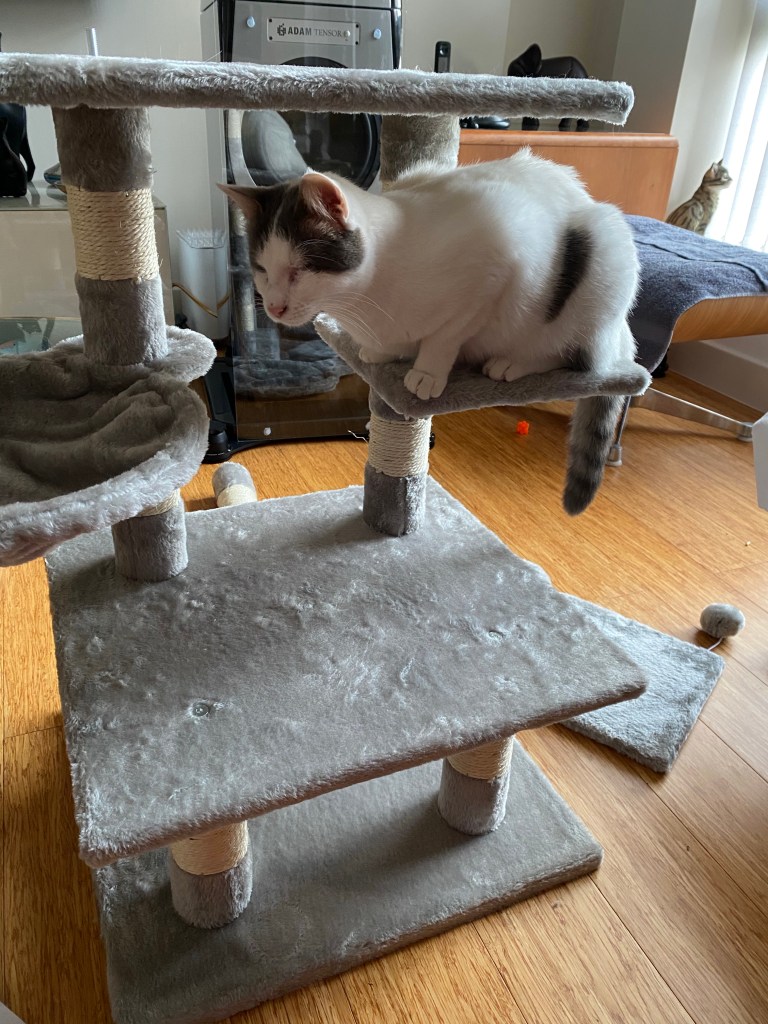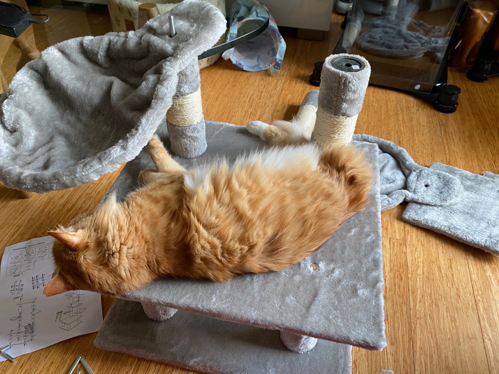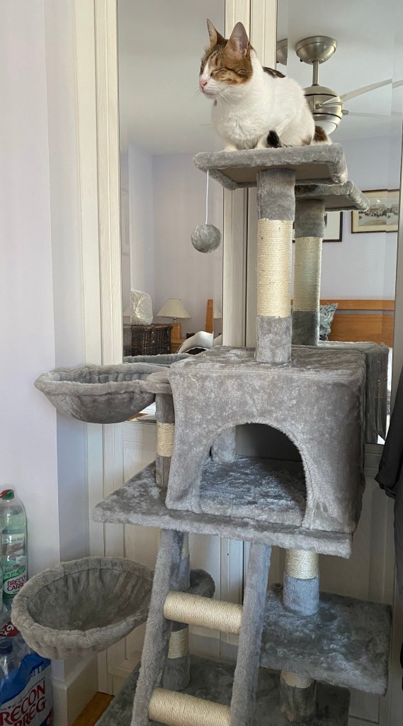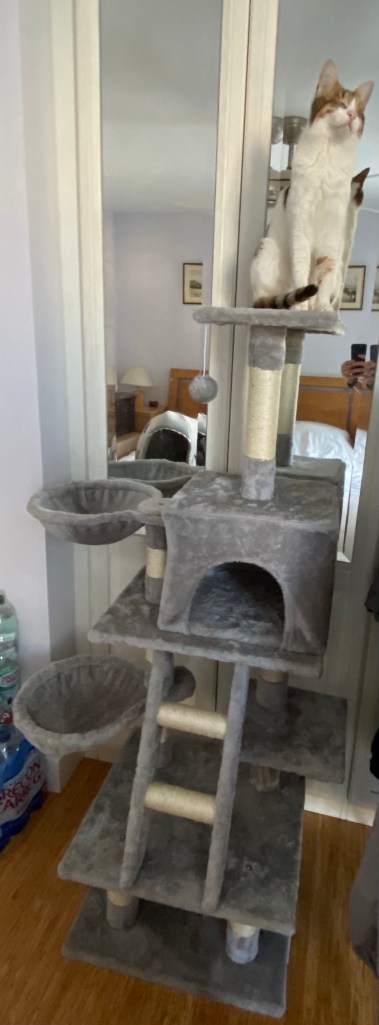 As you all know I love climbing and I do it a lot, even when I’m indoors, I climb this way and that and weaving in and out making use of every bit. I use them all so much that they get worn out and all the scratchy rope untangles and the fabric rips and tears. For ages I’ve been hinting at mummy and daddy that we need a new cat tree. I’ve meowed and meowed over and over again, I’ve climbed it very dramatically and loudly looking over my shoulder and meowing at mummy and daddy and finally they got the hint.