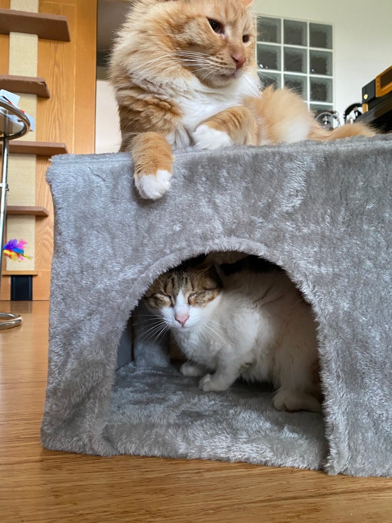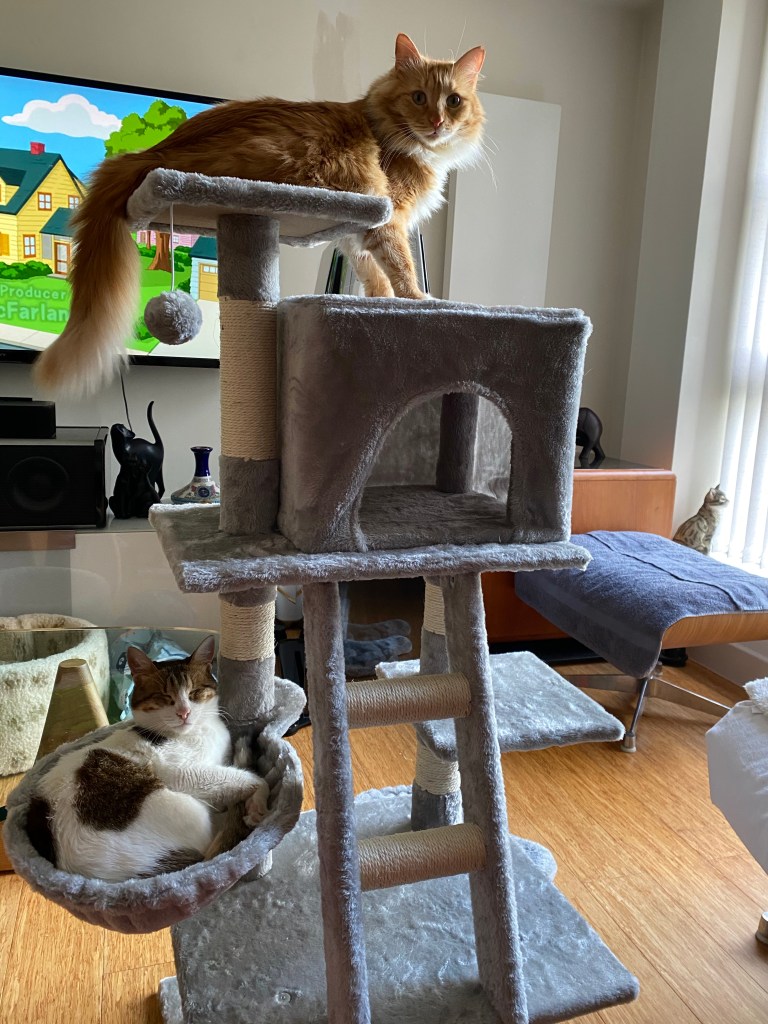 Once you’ve had the chance to try it out you need to give it some rigorous testing. As it turns out with this tree and us perfectly imperfect cats was hat having the hammock right up on the top with the big platform lower down made it very hard for us to get up and down safely, the drop from the platform to the house porch was almost vertical. So I meowed at mummy and daddy when I tried to get down to tell them it was too difficult, not for me of course but for Angelin who doesn’t like leaning over the edge. Mummy and daddy listened to me (of course) and took on board my suggestion to swap the platform and hammock round. This was much better and now we have the purrfect indoor climbing tree.