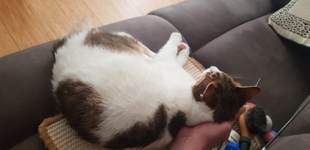Millie here, hi everyone. Daddy is just the best, he plays my favourite nobbly ball games with me and bounces them all over the flat. He taught me that the best bouncing spot was on the small table where I can sit and give the balls a really good swat back. Mine and daddy’s favourite place though is when he sits on the white chair in the bathroom, I love to keep him company. He used to read paper books but that’s no fun so now I keep him company, sit on his lap, climb in his trousers and of course play fetch with the nobbly balls. I love bathroom time with daddy, it’s just me and him, our special time. I’m pretty sure sometimes he goes and sits in there just so we can have some fun time together, just us two. We don’t just play in the bathroom, we play all over the flat, with me running around, up and down the corridor. Lots of exercise helps to keep ‘mental Millie’ at bay but he always makes sure that I have some playtime that I can do sitting down so my back leg doesn’t get too tired. During the day I always get lots of little cuddles, belly rubs and head massages which I just love, the more attention the better for me daddy. We always have a play before bed and sometimes he even lets me attack his feet under the bed covers. I love to curl up in his lap but now Angelin’s always there so I don’t do it as much but I’m working on that. Thanks daddy for being my nobbly play buddy and for playing with me like I’m not different to the others. Oh! I nearly forgot, he always, always shares his human food with us but it’s me that always get first offers on any leftovers. Love you daddy, Millie.