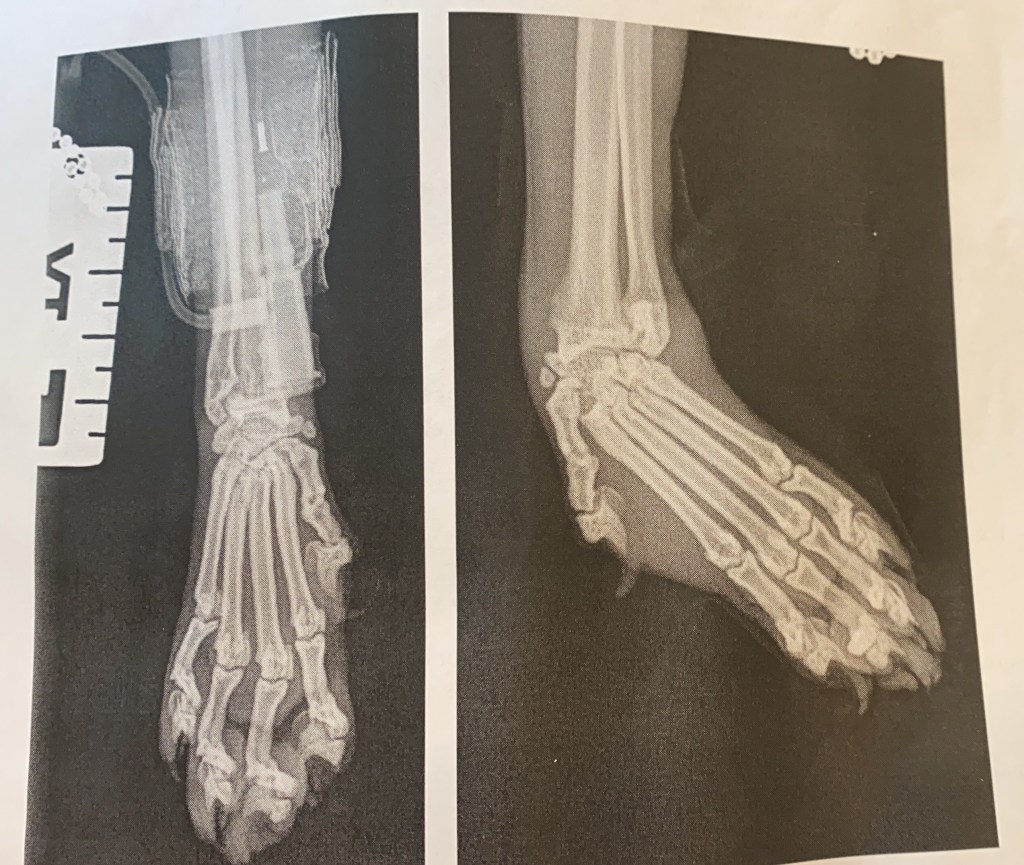 After a long sleepless night and anxious morning we got a call from the vet. The X-ray had showed that she had badly damaged her paw and ripped all the ligaments which is why her paw was at such a horrible angle. They described her injury as a catastrophic one and there was no doubt she would need surgery to repair it. They were concerned though as the x ray wasn’t detailed anough to show the state of the tiny bones in her ankle and paw so to get a better idea of how to fix her they needed to do a CT scan as well. We agreed. There were two options at this point: