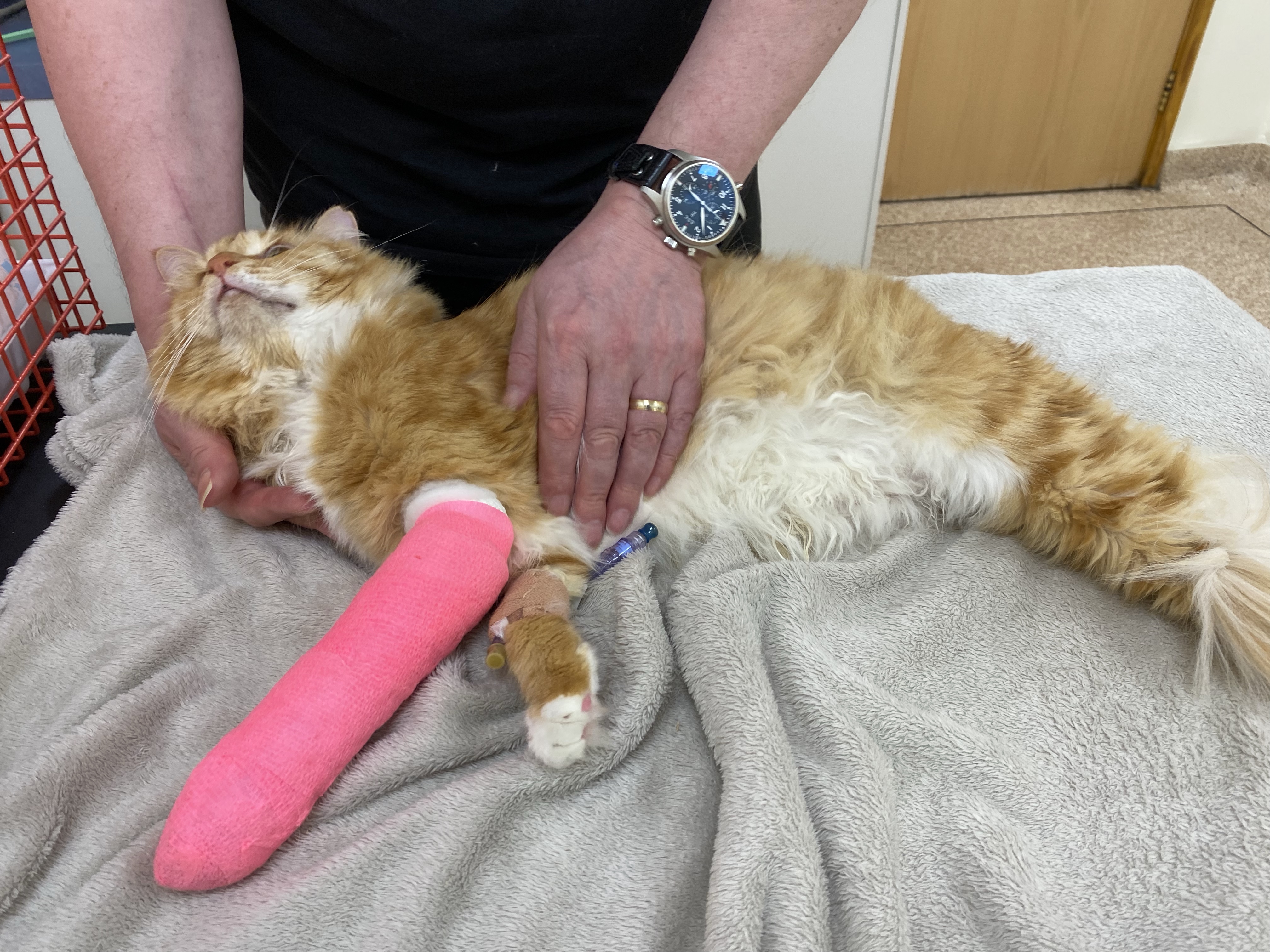 I got dressed and rushed her to the emergency vet. Millie protested loudly at this all the way up and showed her displeasure by being sick in her carrier. This is normal for Millie as we think she suffers from travel sickness. Once at the vet she had a good look at Millies back leg, couldn’t find anything immediately wrong so put her on the floor to see her walking. Her gait from her back leg looked fairly normal and just as I was starting to feel stupid that I was an over anxious cat mum and had taken her up there for no reason, there it was – as she sat under the vets table I spotted her front paw bent at a horrible angle! It’s the front paw on the same side as her one back leg, that’s why we thought she had a back leg injury she was compensating for her damaged front paw.