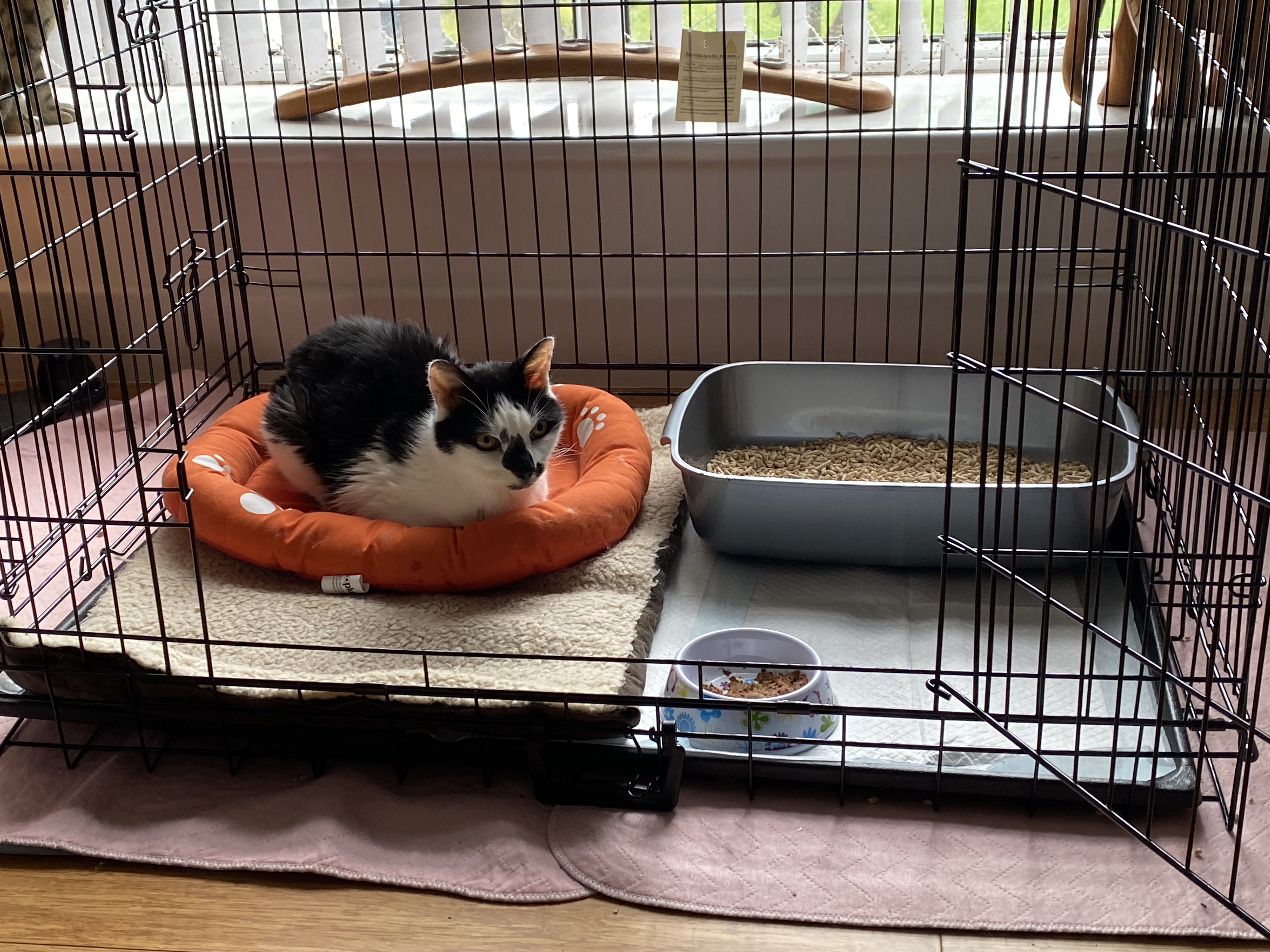 We managed to bring her home yesterday to spend a couple of days with us before her operation which they’ve scheduled for Monday. She’s spent some time in a cage that we’ve prepared for her to keep her from being too active and Peppar gave it a thorough inspection just to make sure it was all set up properly. She’s spent most of the weekend cuddled up on daddy’s lap sleeping, she’s exhausted bless her.
