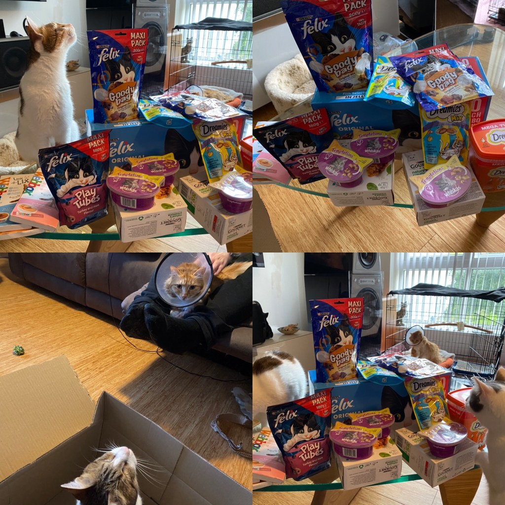 Then a real surprise, a package with my name on it arrived. What is it? What is it? We all meowed. Mummy opened it up whilst Millie watched from daddy’s lap. Well, what an ameowzing box, as mummy opened it she just said “wow”, she pulled out a box, then another one, then a packet and another and another, it was a bottomless box that was full of food and treats for us kitties. As she put each yummy gift on the table mummy had tears streaming down her cheeks and even daddy said he was choked up, mummy said to daddy “one of Jenny’s friends on Instagram wanted to send a small package when they heard about Millies accident and how much it cost” daddy said “this is way more than a small gift, it’s just so generous, what amazing friends Jenny has.” They we’re so stunned by such generosity that they couldn’t bring themselves to pack anything away that night and left it all ther on full show until the morning when mummy opened up some of the food for us to try at breakfast. It was so yummy and even better knowing that it came with so much love.