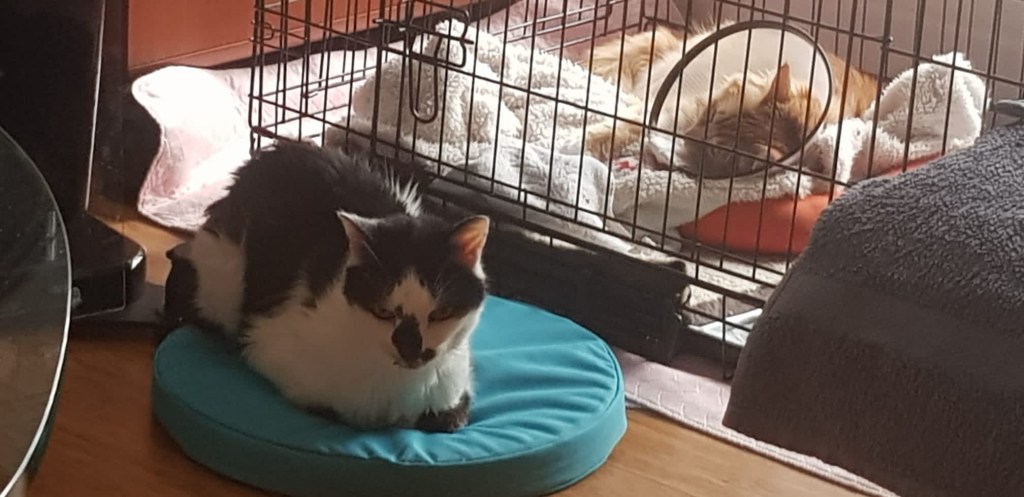 Then one day mummy and daddy started moving loads of stuff around, picking things off the floor and putting them on the bed, one of our litter trays moved into their toilet, then even Millies cage moved into their bedroom. “What’s going on?” I meowed. “Well Jenny you know those moths that you love to chase and catch? The mans going to spray something that should kill them so they stop flying around the flat.” “Kill the moths! But that’s my job mummy” “I know you love catching them Jenny and you’re so good at it, we rely on your super hearing to show us when they’re flying around as we can’t hear them like you can. We need to get rid of them though as there’s too many for you to catch and they eat our clothes”. Well all four of us were bundled into the bedroom and kept prisoner for what seemed like a week, Peppar, chilled on mummy’s pillow, Millie was in her cage but then daddy reached in and fiddled about with her silly cone and pulled it off! You’re cone free Millie he said so she then had a major washing session and then slept in her cage, Angelin poddled about quietly and I meowed and meowed and meowed and meowed and then meowed and meowed some more. I hate being confined specially with everybody there, this isn’t right, this isn’t how our day normally goes, I’m a kitty of routine and this is just not normal. I wanted out! I could smell a horrid chemical smell through the door and I didn’t like it, plus how was I going to get out for walkies with mummy when I’m stuck in here! Let meowt! I’m being held against my will!