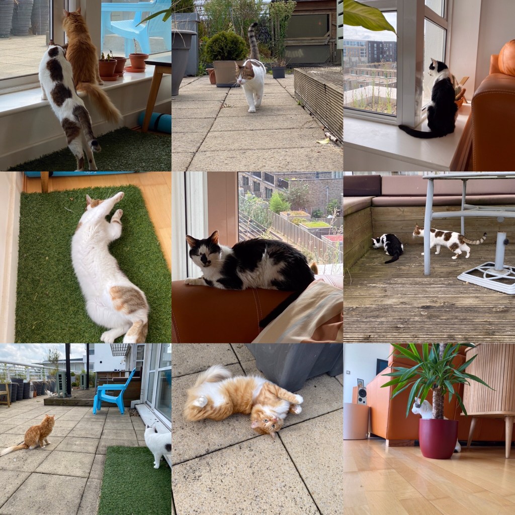 Then mummy said come on then, let’s explore outside…YEY about time mummy. Slightly cautiously I went out first on my own with mummy, I gave everywhere a good sniff and once Id explored mummy let Angelin , Millie and Peppar out as well. Mille decided it felt good to roll around on the rough ground, a good roll about feels great for us cats, you can really give those hard to reach places a good scratch. Angelin was very timid and sat listening to us from the doorway, then out came Peppar too, he was off exploring like a true pro, so I followed him about checking out the paces he wanted to see. I could smell the same scents up here as I can smell when were out on walkies but they were just a little more distant. Mummy kept a good eye on us all as she said we were very high up and she didn’t want any of us to explore too high up so it was a quick trip out and then when Millie started to get a bit excited being out in such a wide open space we headed back indoors. All except Peppar who point blank refused to come in, he was growling at mummy but she knows him too well to be talked to like that so with a bit of a stern talking to he eventually headed in too and then sulked under the table. “Were going to have a tough job getting him out from under there later, he’s being a right grump” mummy said to daddy.