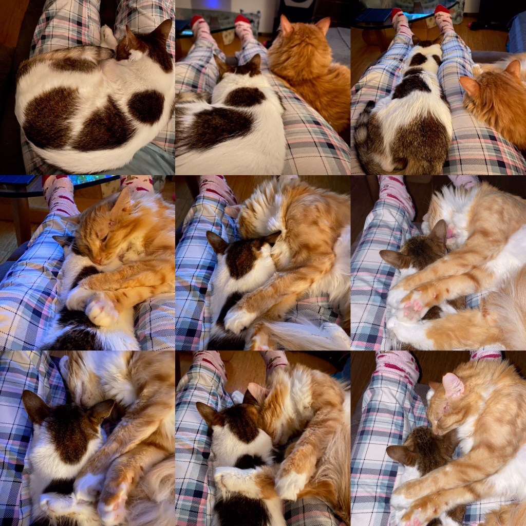 Then, once I’ve finished and I’m back down to the regular part of the tree mummy reaches up and I climb down onto her arm for a celebration cuddle and lift back down to the ground. One little clip and I’m back on my lead and off we go to finish our walkies. Each time I get to free climb, I go a little bit higher and get a little more confident as I map the tree over and over. I love exploring with mummy but it’s tiring work but I want to show mummy how much I love her. She lets me explore, challenge myself and be an adventure cat so after I’d had a little nap up on the scratching post bed I crept down the sofa and snuggled on mummy’s lap. What a perfect end to an adventurous day. Then Millie hopped up and snuggled in too and we made a snuggle puddle on mummy’s lap.
