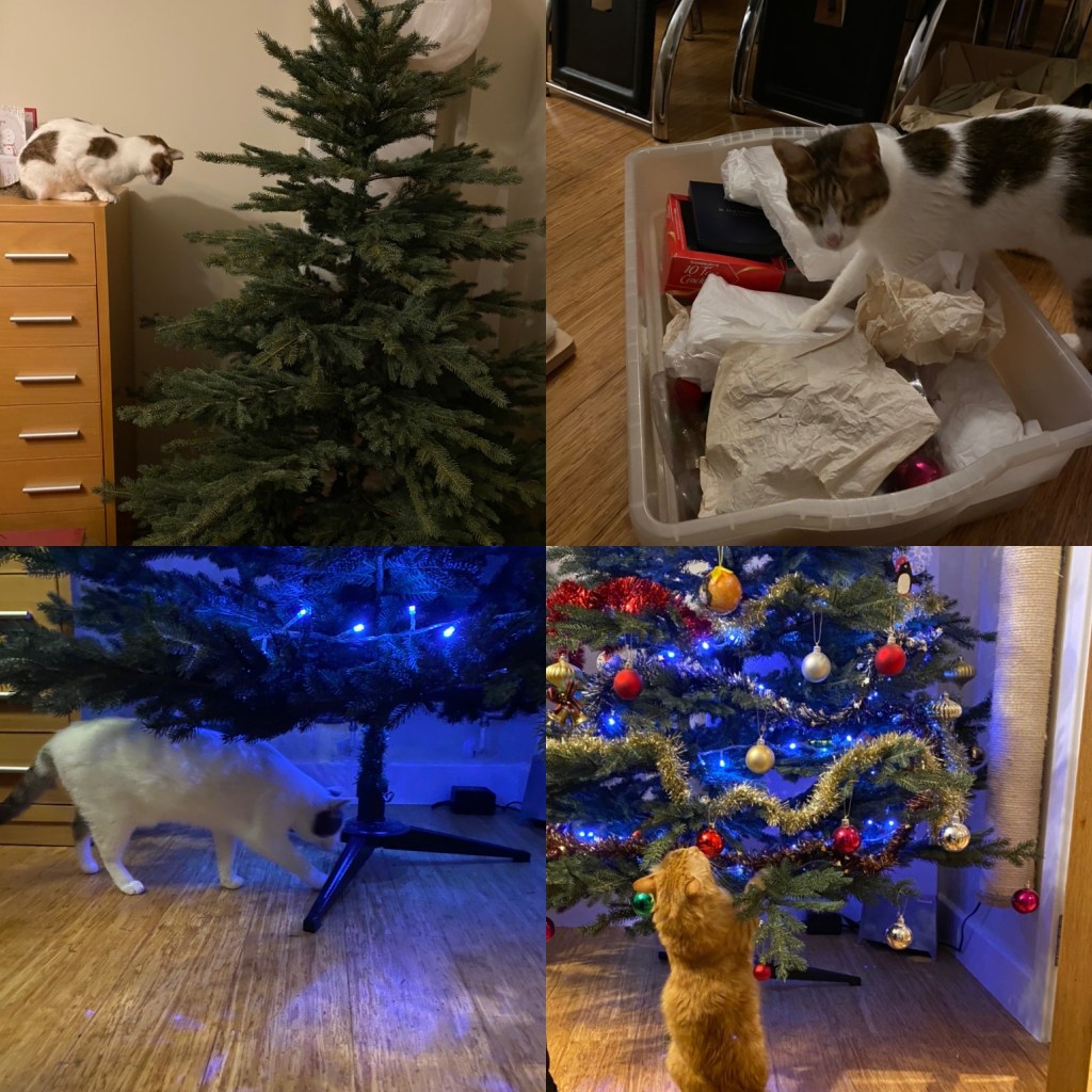I also helped her put up the Catmas tree, I told mummy where to put it and chose which decorations for her to put on the tree to make it look pretty, they smell all glittery and special and magical. Millie and Angelin haven’t had a tree before so Angelin was busy checking it out from the bottom up, she was looking around to see if she had any presents under there. I had to explain to her that Santa Paws only comes in the middle of the night when we’re all sleeping, it’s all part of the magic that is Catmas. Millie then checked out the lights and the baubles, she was so excited by all the shiny, glittering, sparkling things tantalisingly within paw reach, oh how on earth is she gonna be good with all this temptation around?