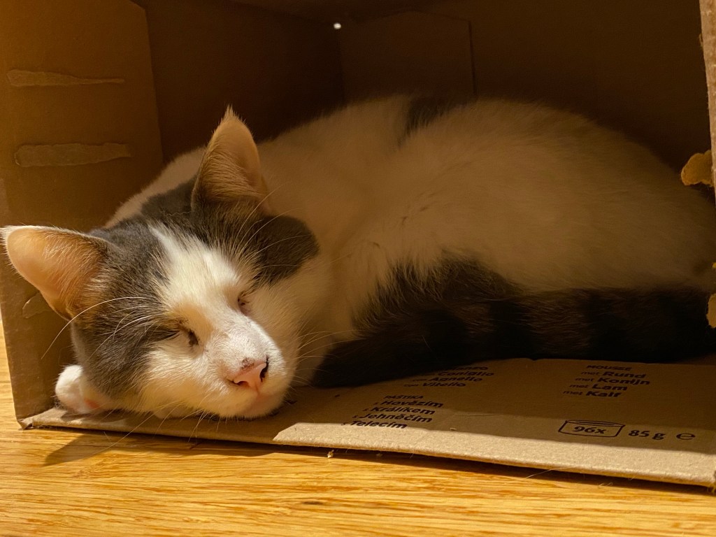 There was so much going on and Angelin was so excited about Santa Paws coming and that Catmas is nearly here that it was all just a bit much for her so she went to dream of Santa, presents and magical days in the quiet of one of her favourite boxes.