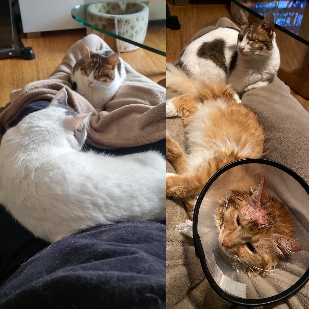 I would never dream of playing favourites and always treat my pawents equally so just to make sure mummy didn’t feel left out when she went to bed I crept up the bed and snuggled into her head on the pillow for a little bit, just like Peppar used to, she reached up and gave me a gentle rub and we drifted off to sleep together. Whilst the weather has been a bit chilly we’ve all been piling onto the bed in the night, cuddling in between mummy and daddy, the whole furramily all together. One night when I was creeping up the middle of the bed to get the best spot in between them I stepped on something a bit kind of squishy, the squishy thing didn’t like being stepped on and a very upset Millie came exploding, meowing and hissing out from under the covers. She woke up both mummy and daddy scaring them wide awake in an instant, she even managed to get out of her cone on the way out! How was I to know that Millie, cone and all had got under the covers to cuddle in with mummy and daddy, how she managed it I’m not sure but that was really taking snuggling to a whole new level.