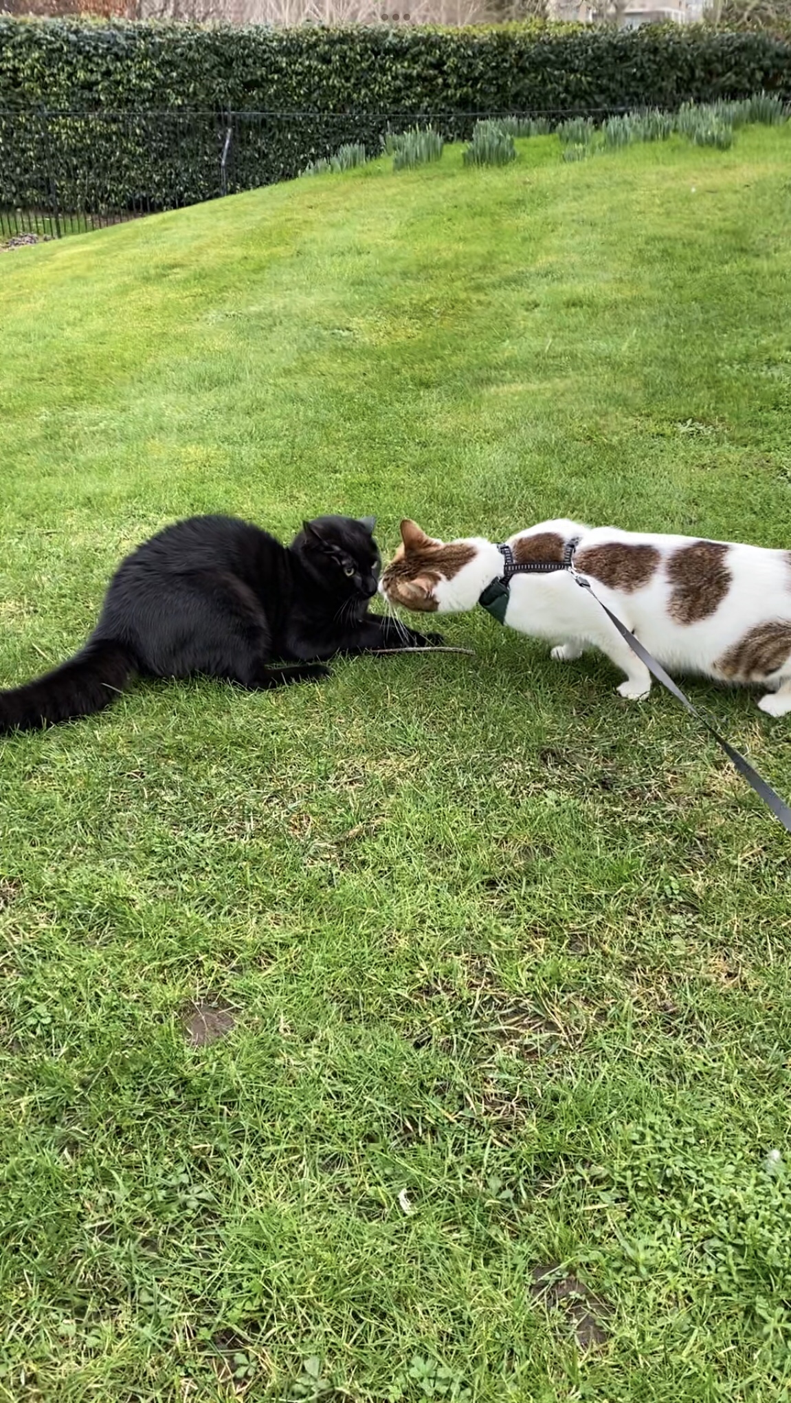 First of all he just followed us around at a distance, curious and timidly stalking, always there in the background. Every time mummy turned round there he was following us, curious about who we were, what we were doing and where we were going. Then he started getting closer and closer and eventually came over to say hello to me. He came up fairly close to me and we had a little nose to nose sniff but then I moved a muscle and he ran away, then came back, then ran away! Silly boy, I’m not going to hurt you, I’m a kitty cat just like you but a little different but it’s ok we can be furriends.