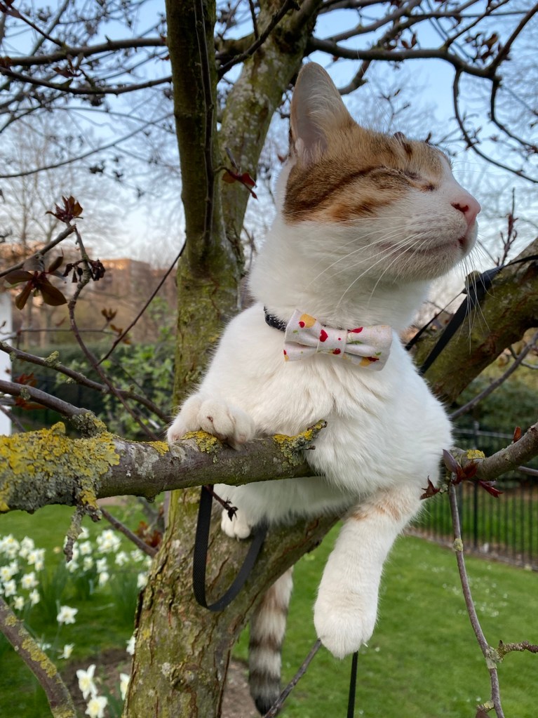 When the weather is colder I love to run around and chase things, darting this way and that, it really gets the blood flowing and the muscles warmed up. Then one big run around the grass at full speed and then a quick turn and I’m heading straight for my favourite tree. Just when mummy thinks I’m going to run head first into it up I go, clearing the first bit of the tree trunk in one big jump and then scurrying up and up until, I get to the point that spoil sport mummy won’t let me go any further and I feel the pull of the lead stopping me from reaching the top. “That’s far enough Jenny” she says, but mummy I meow I want to go all he way up, right to the top.