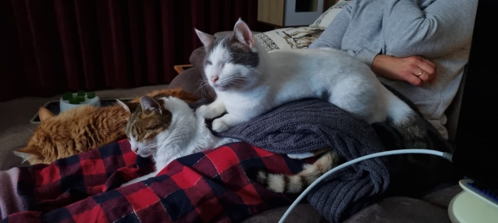 If you are going to cuddle with a buddy, you’ve got to consider how. Do you do head to head, bum to bum, nose to tail, side by side or even single decker or double decker (we’ve never gone for the triple decker…yet)? Each one has its advantages and disadvantage, bums can make comfy pillows but you’ve got to hope there’s no windy bums, specially with my super blindie sense of smell. Then there’s face to face which often means you can get a wash for those hard to reach parts but then one wrong move or a nibble in the wrong spot and it goes from cuddles to fisticuffs in the blink of an eye. Then there’s the expectation that you return the washing favour and change from washee to washer. Side by side gives extra body warmth for when those extra cold days come along, then, for me, it’s a matter of where’s Millie? She’s the floofiest and therefore the warmest so a great real life snuggle blanket who you can bury yourself right into but you’ve just gotta be careful as the downside of burying yourself into long floof is that it can tickle your nosey.