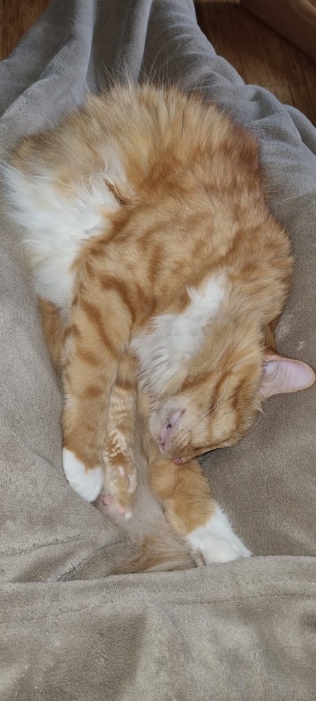 I thought this week I’d share some of our more unusual positions that us cats can get into, this isn’t just a blindie thing but more just a cat thing. Sometimes mummy and daddy will walk into a room, see us and just say “how on earth did you get like that?” Or “That really can’t be comfortable” sometimes they just laugh at us.