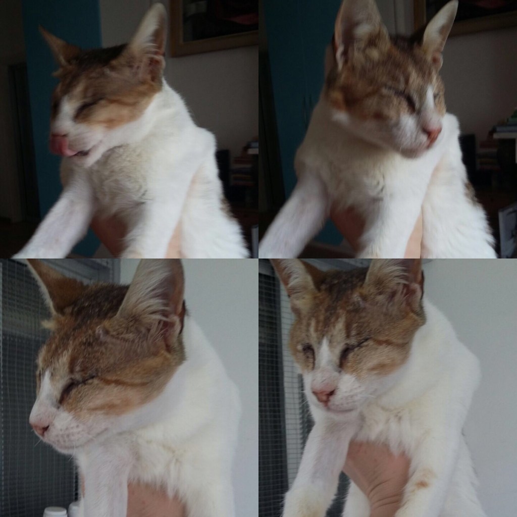 Well, apparently Peppar wasn’t very well behaved at the vet and wouldn’t let them have a look at him and hissed at them and tried to bite them! He’s not a good like I am, I learnt early on that human vet doctors are there to help and certainly for me they made me feel so much better. I learnt to let them touch and feel me, open my mouth and even take my temperature which is NOT a nice thing to do. Sometimes it’s easier to just let them do what they need to do and get it over and done with. Peppar doesn’t share that view though. This meant that he had to go back again the following day, mummy said they were going to make him go to sleep so they could have a good look at him. The vet didn’t want to risk losing a finger or two as it was his teeth that mummy and daddy were worried about and that he wasn’t putting weight on. So poor Peppar had to go back and then a few days later he had to go back again, I was worried about him and I know mummy and daddy were too, after the first visit he had some bald patches and a nasty sore bit on his neck which he kept scratching and mummy said he was making it red raw, so they had to put on a bandage to stop him scratching until he went back to the vet who could give him a cat onesie to wear like little Angelin had after her lady operation.