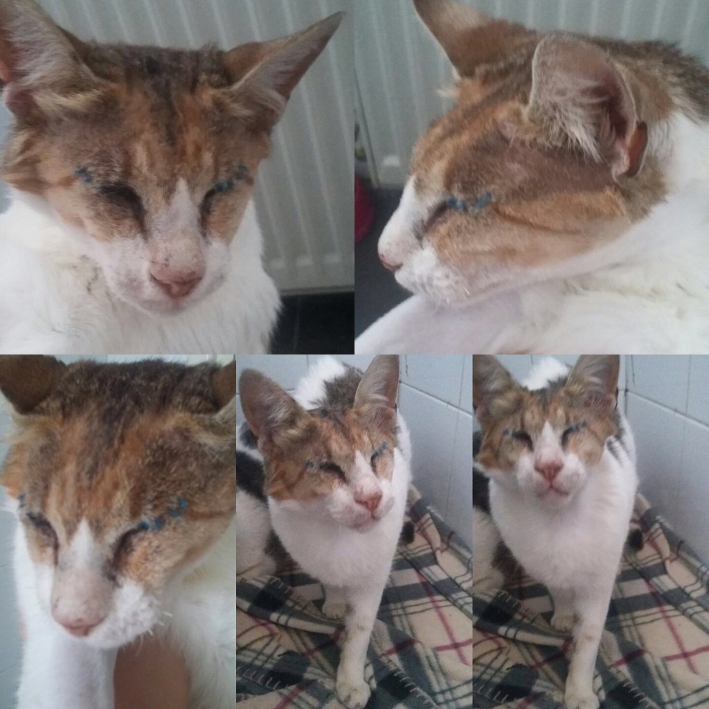 The next thing it knew it was waking up but felt different, it couldn’t open it’s eyes, it tried and tried but it’s eye lids didn’t work. The kitten was confused but then it realised that the pain in its eyes it had grown to accept as being normal had gone. It was a relief for the little blind kitten and that relief was so much greater than the fear of the lack of movement of its eyelids. It had been painful for the blind kitten to blink and even though it couldn’t see before it’s eyes still moved when it was looking round and that too was painful. Now though nothing, no pain at all. The kitten washed its face and there was something else different – where had it’s whiskers gone? How could it feel around and not bump into things? The kitten had grown to rely on its whiskers to stop it from bumping into things, then as it moved – bump! The kittens nose found the edge of the cage it found itself in. “It’s ok my sweet baby” said the familiar voice of one of the humans. “You’ll feel better in no time, we’ve had to remove your eyes as they were so badly infected. I’m so sorry we couldn’t save them” she said, “but it’s ok, lots of kittens have this done and they’re fine and once you’re better we’ll find you a nice family and a home to live in.” With this, the kitten was exhausted and drifted back off to sleep.