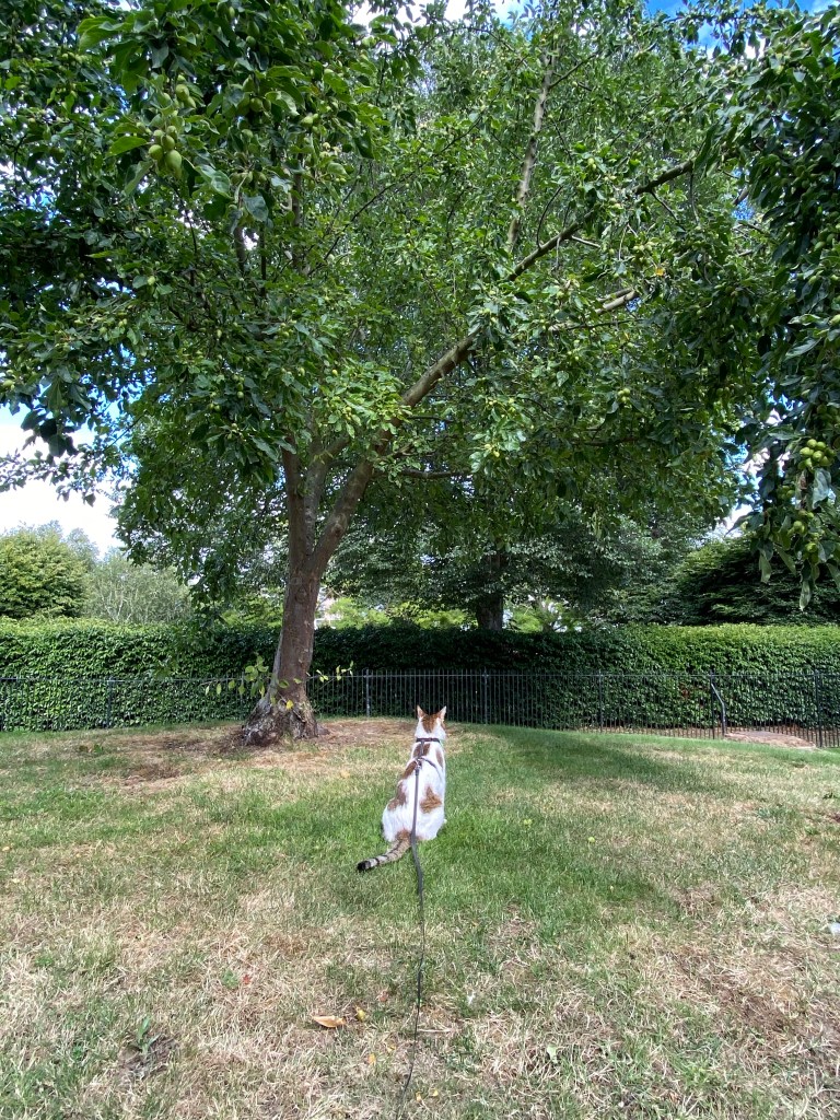 My being good streak didn’t last very long, whilst trying out one of my new bandanas I really thought I had better make sure I try them in every situation, I snuck through the fence into the park and headed for one of the big trees. Mummy sometimes lets me explore the land just beyond the railings so I know there’s trees there but this time I headed straight for one, there was a good smell and a noise I could hear up the tree that was just too tempting today. The trees in the park are bigger than the ones in our gardens so I can really practice my climbing skills. I climbed higher and higher and higher, paw by paw I was higher than I had ever been before and I could feel where the tree branches out but then the lead tugged at my harness, I was as high as I could possibly go. Look mummy, look at me and how high I’ve climbed I shouted from the top. Good girl Jenny she said now come back down carefully, just follow the tug of the lead and you’ll be fine. It’s ok mummy I’ll be fine I’m a master tree climber which includes getting down too!