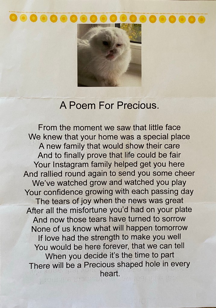 Then, as if that wasn’t enough, we got sent the most beautiful poem by some of my furriends on Instagram, needless to say mummy, again had tears of love streaming down her cheeks, she said between sniffs, “what wonderful people there are in this world, who would have known that one tiny, poorly kitty could make such a big impact in this world. We’re so blessed to have found her.”